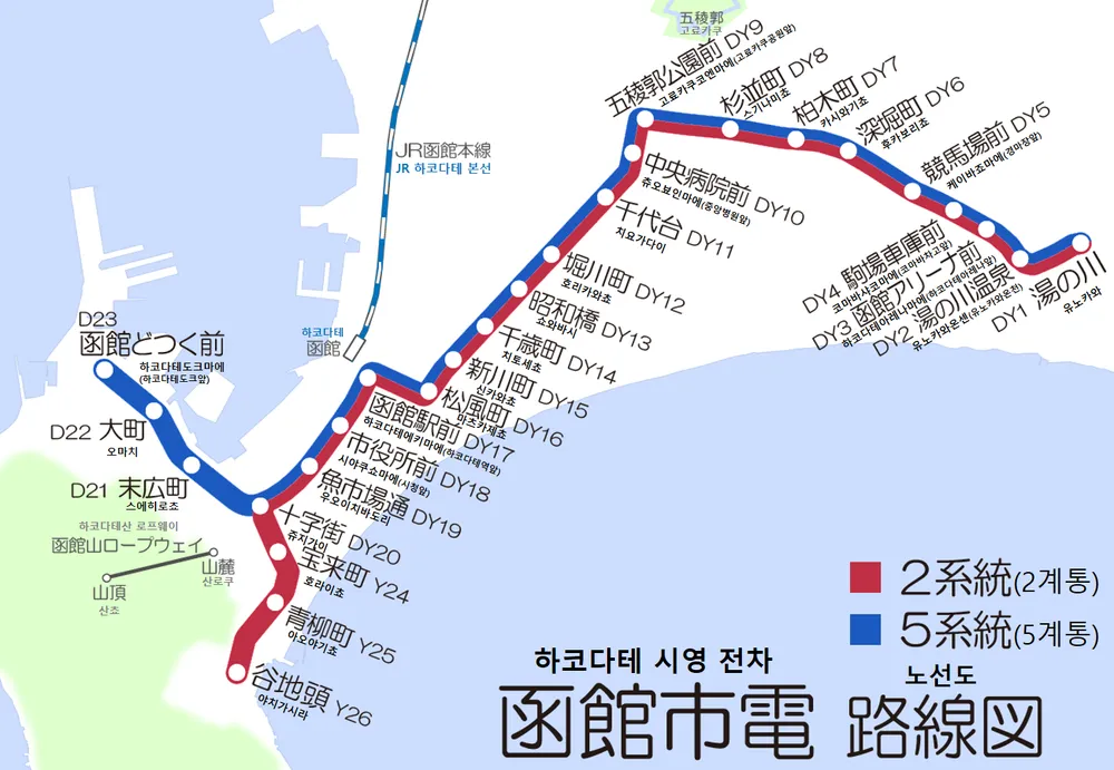| 구간/노선 | 5계통: 유노카와~하코다테에키마에~하코다테도크마에 2계통: 유노카와~하코다테에키마에~야치가시라 |
