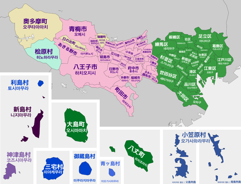 위의 지역이 모두 도쿄도, 그리고 오른쪽에 있는 초록색 부분이 도쿄 23구에요.