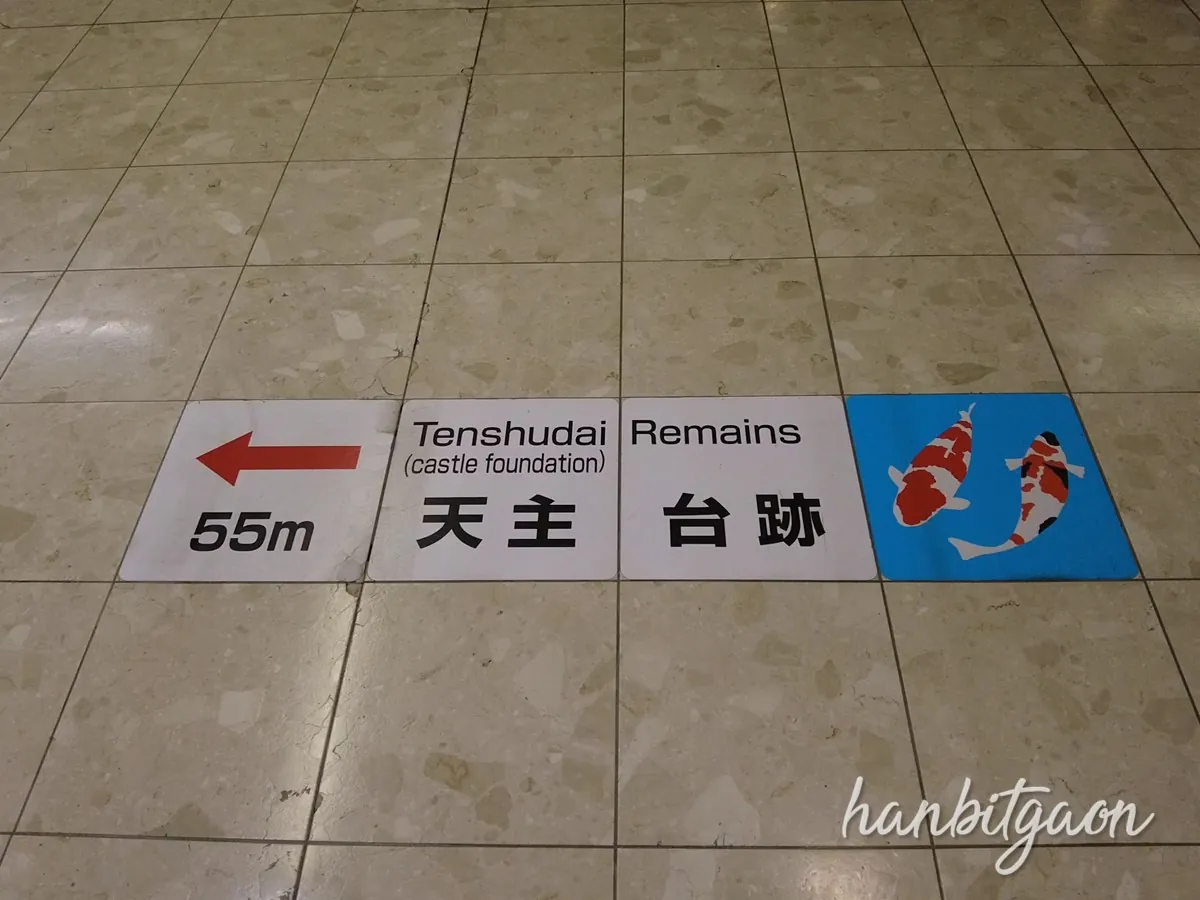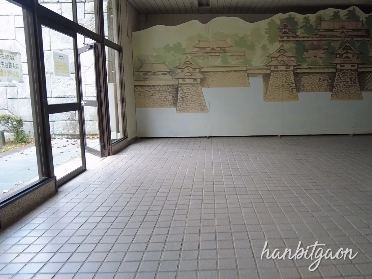 미하라역에 보면 바닥에 성터로 가는 길을 안내하고 있어요.