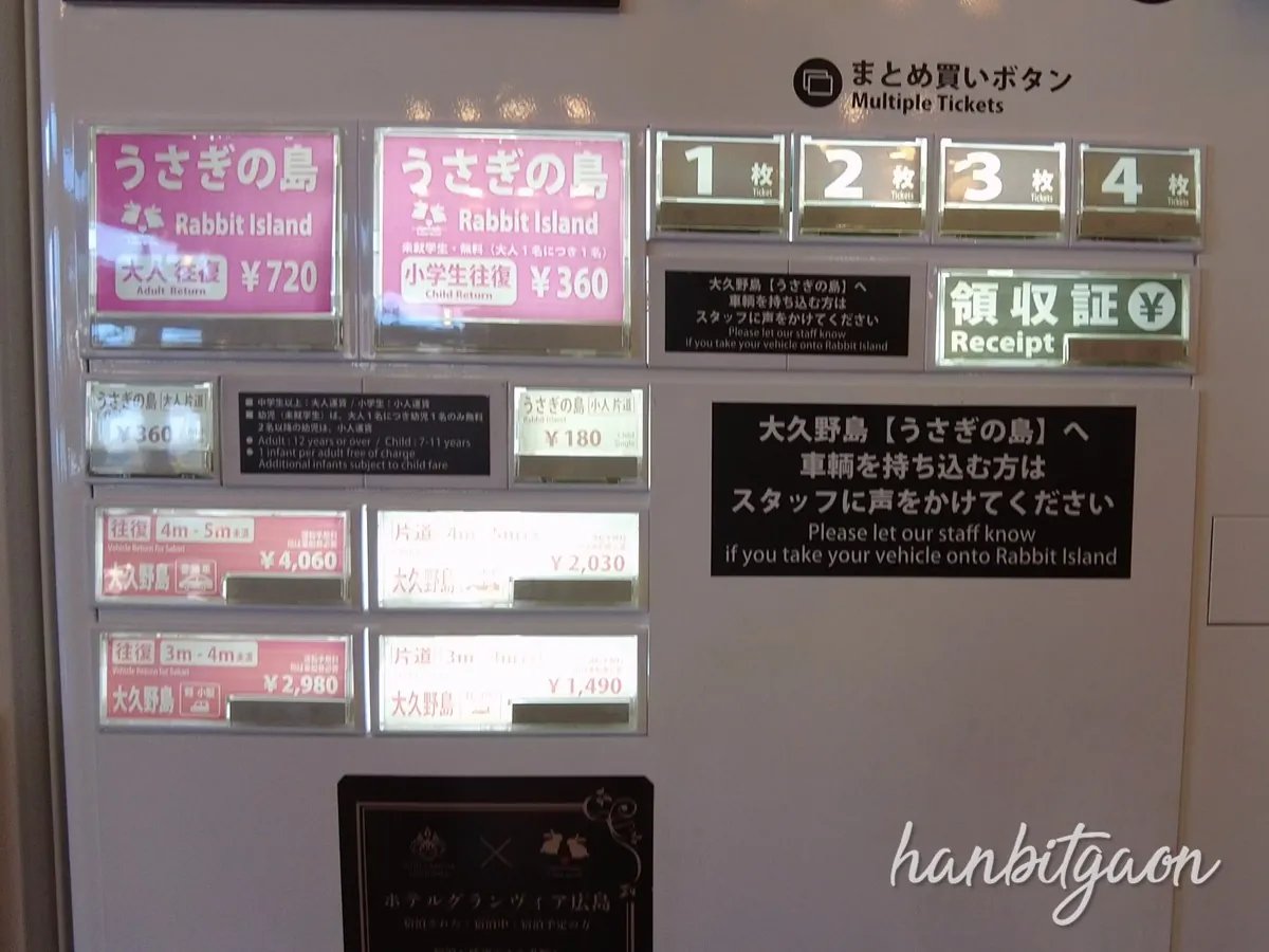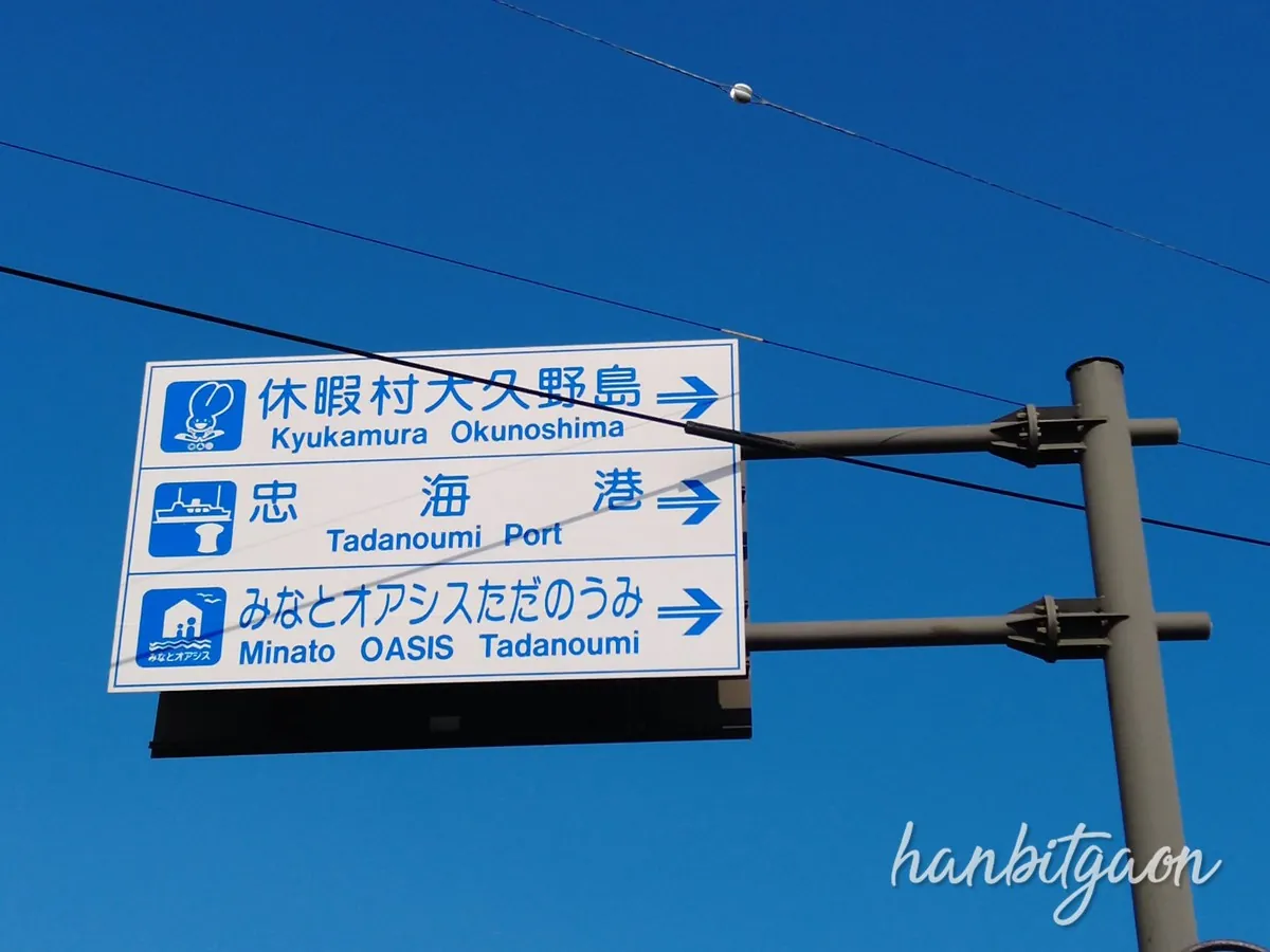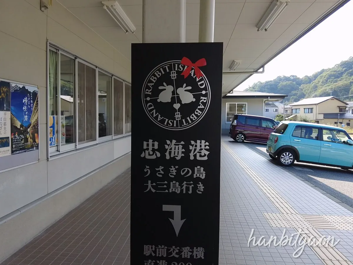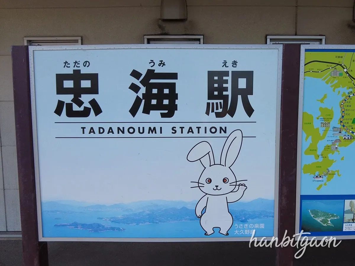 토끼 모양이 그려져 있는 것에서 알 수 있겠지만, 역 근처의 항구에서 배로 10분? 15분 정도만 가면 토끼섬으로 불리는 섬이 있어요.