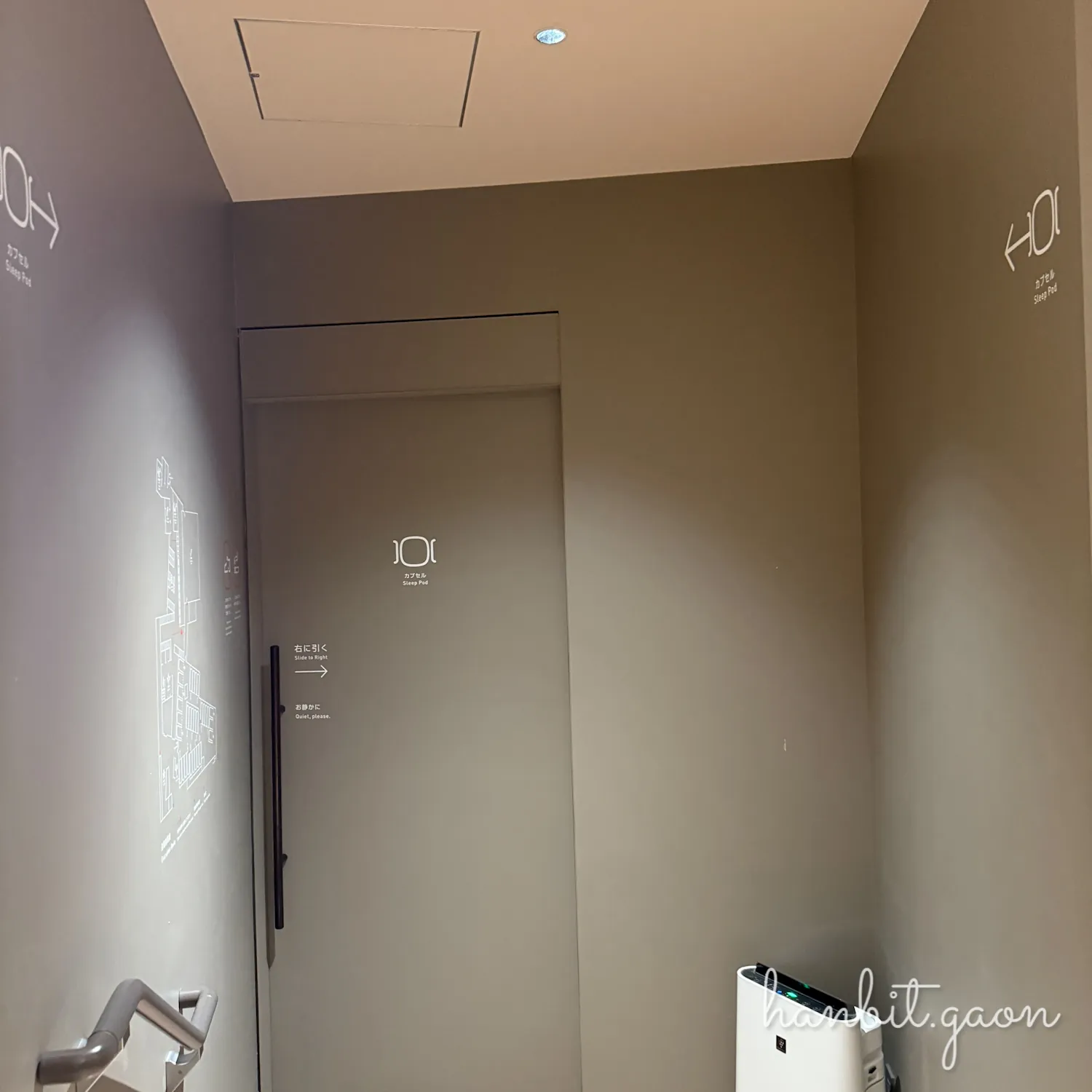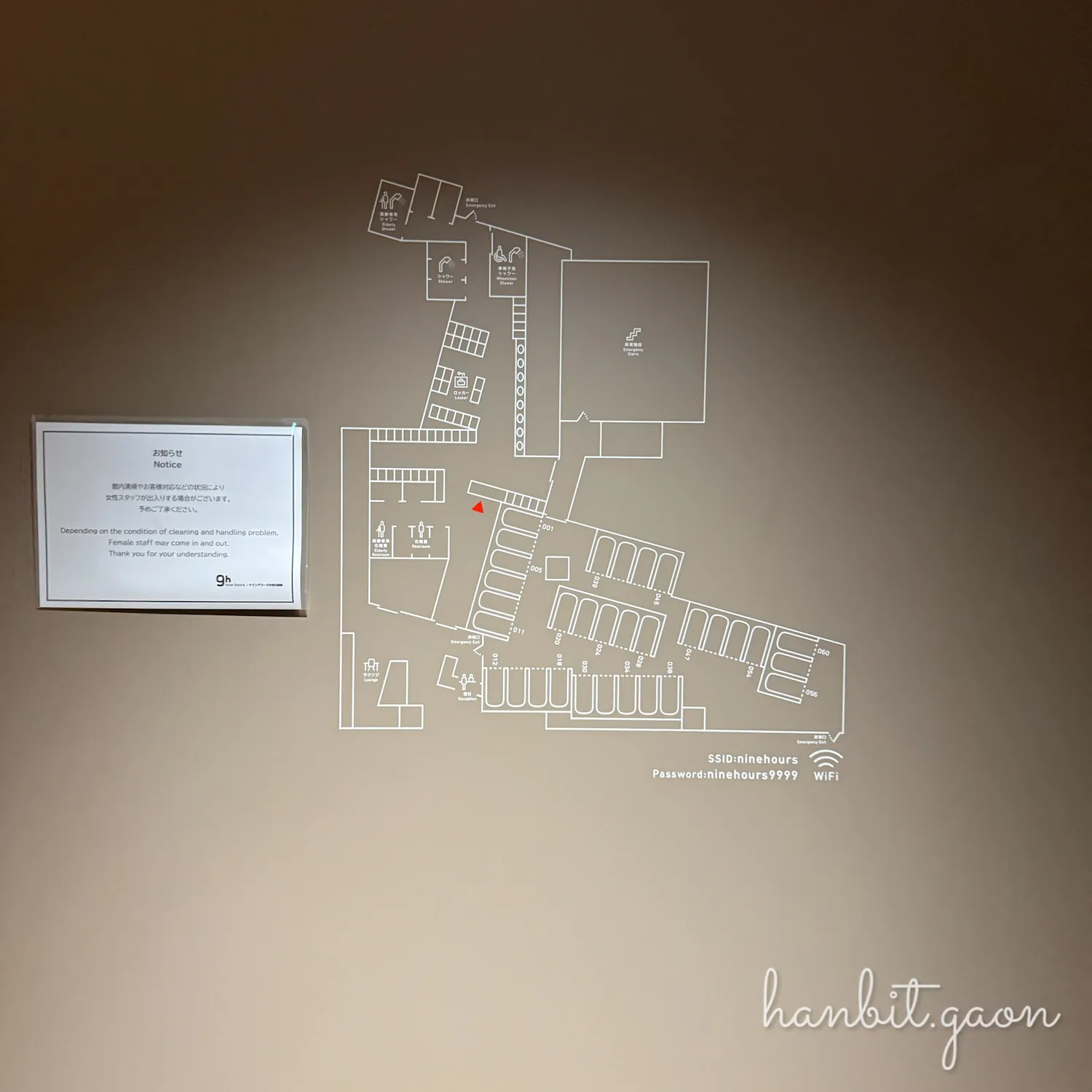 같은 체인인 '나인아워스 하카타스테이션' 지점과 마찬가지로 2층 구조의 캡슐인 호텔이에요.
