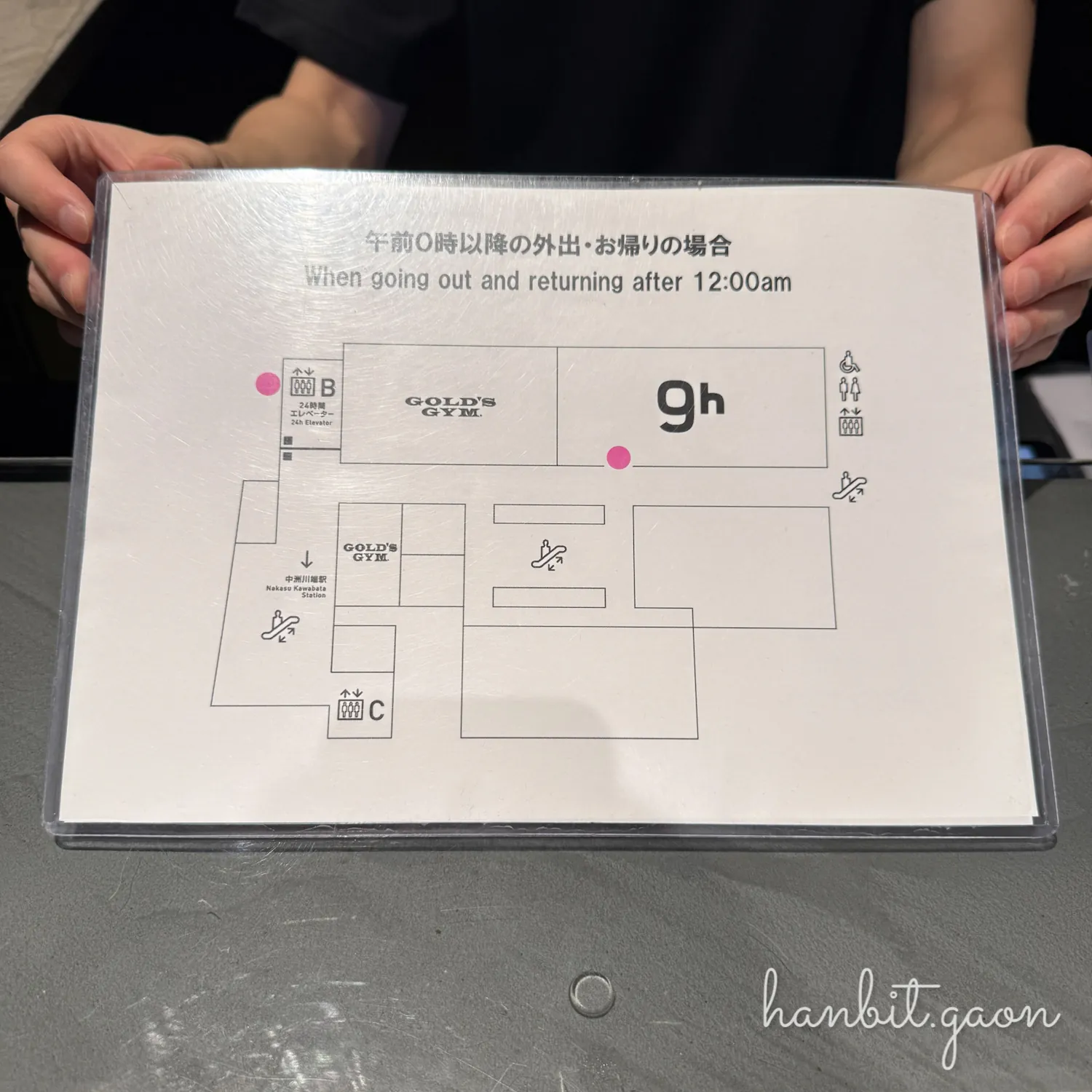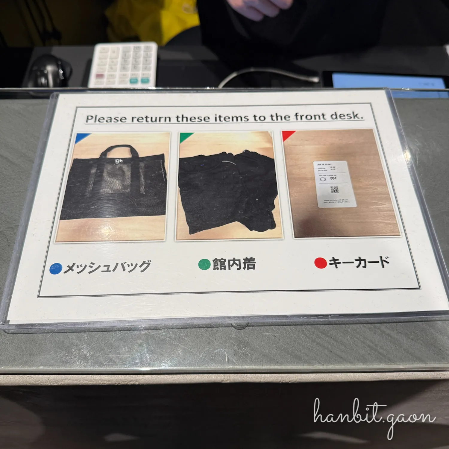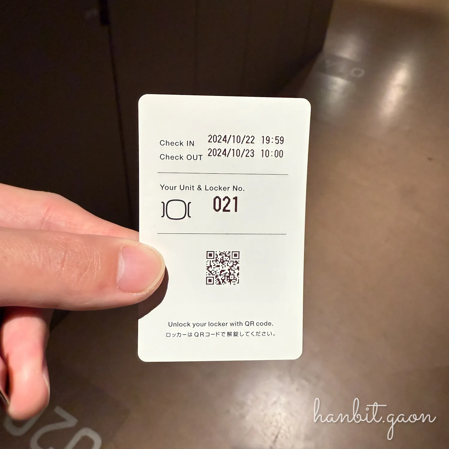 하카타스테이션 지점과 마찬가지로 뒷편에 있는 QR코드로 입장과 로커를 열 때 사용하는 키에요.