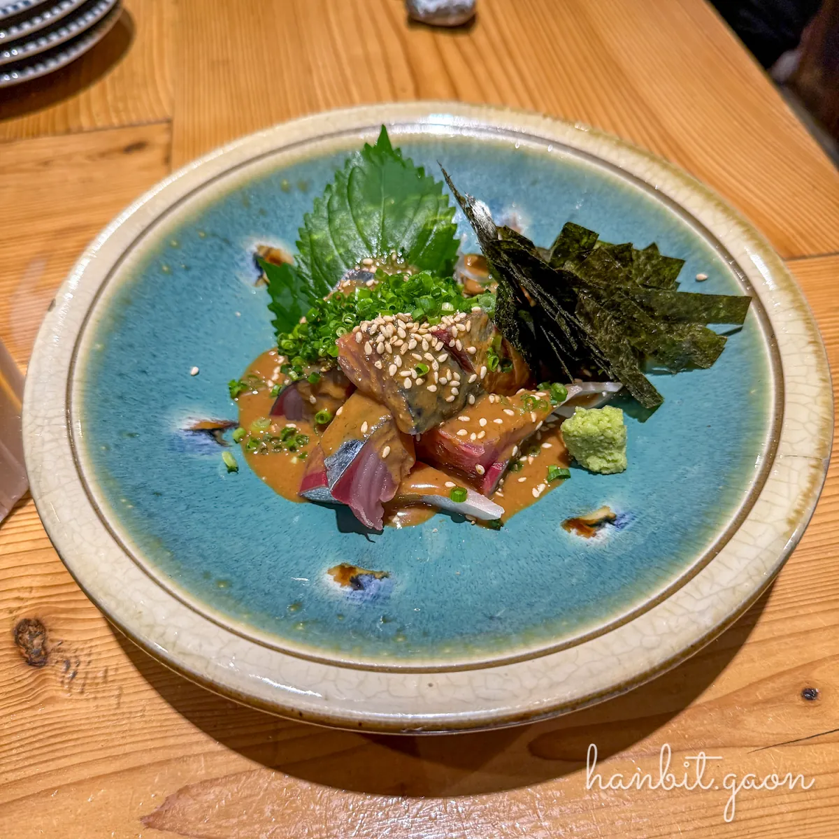 추천메뉴로 추천받은건 고마사바(ごまさば)라는 메뉴였는데, 이후에 찾아보니 고등어회에 간장과 참깨 등을 섞어서 버무리는 하카타의 명물이라고 해요.