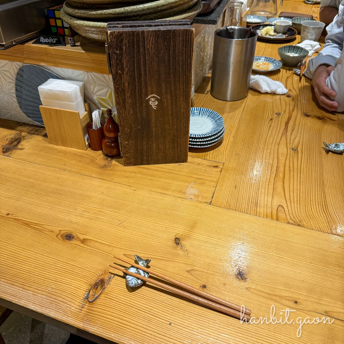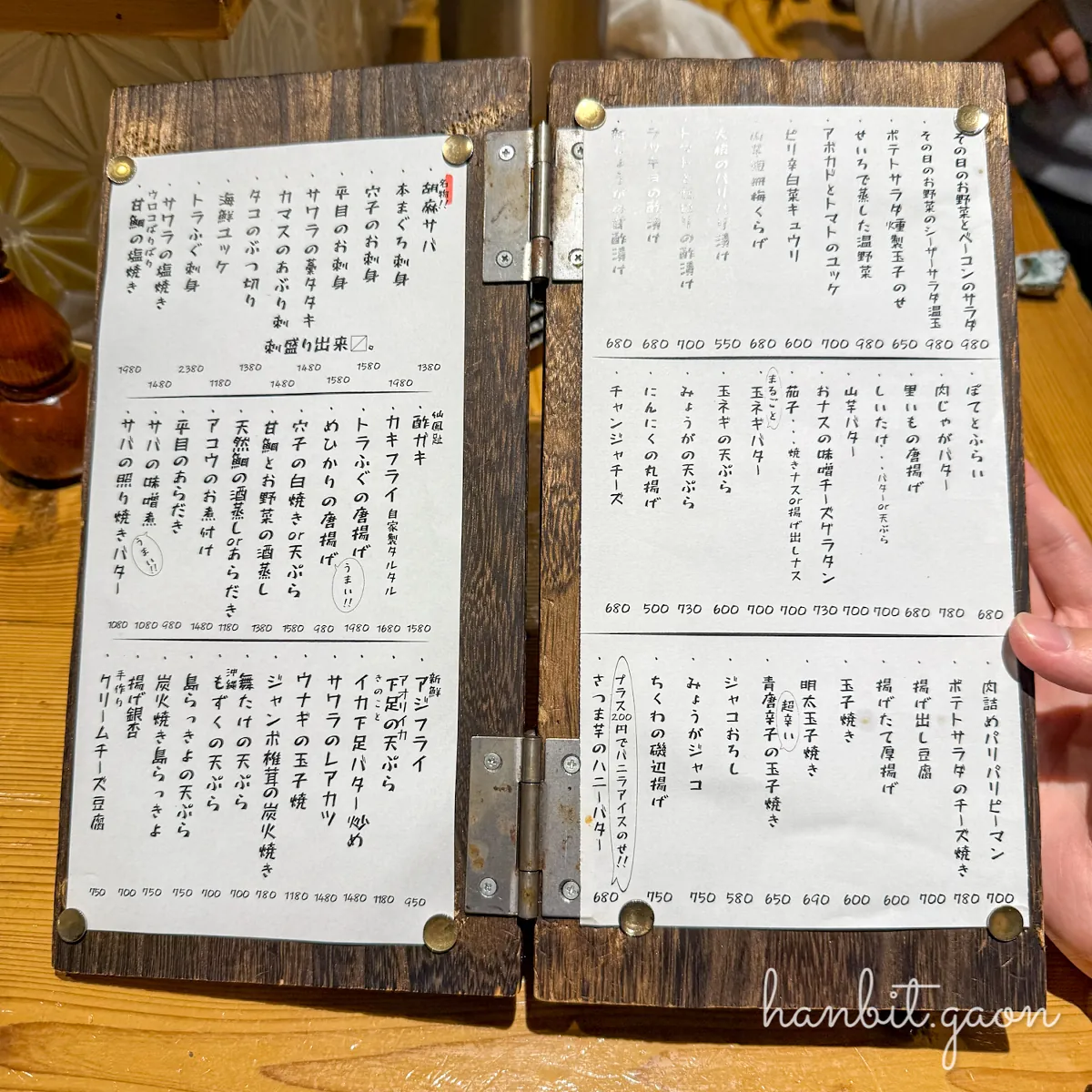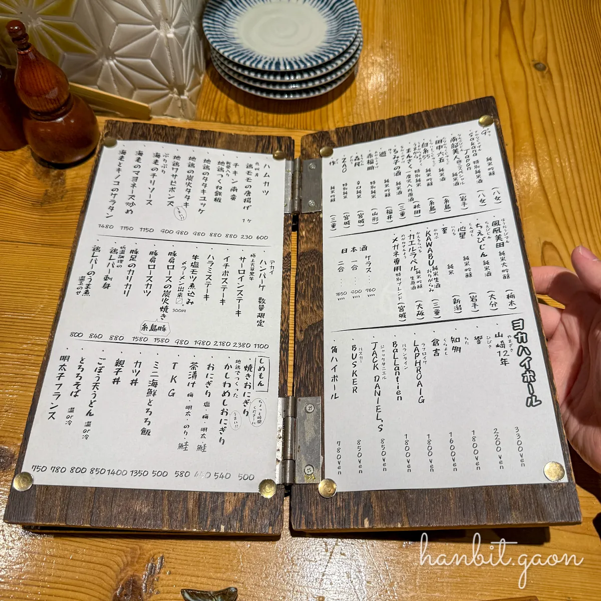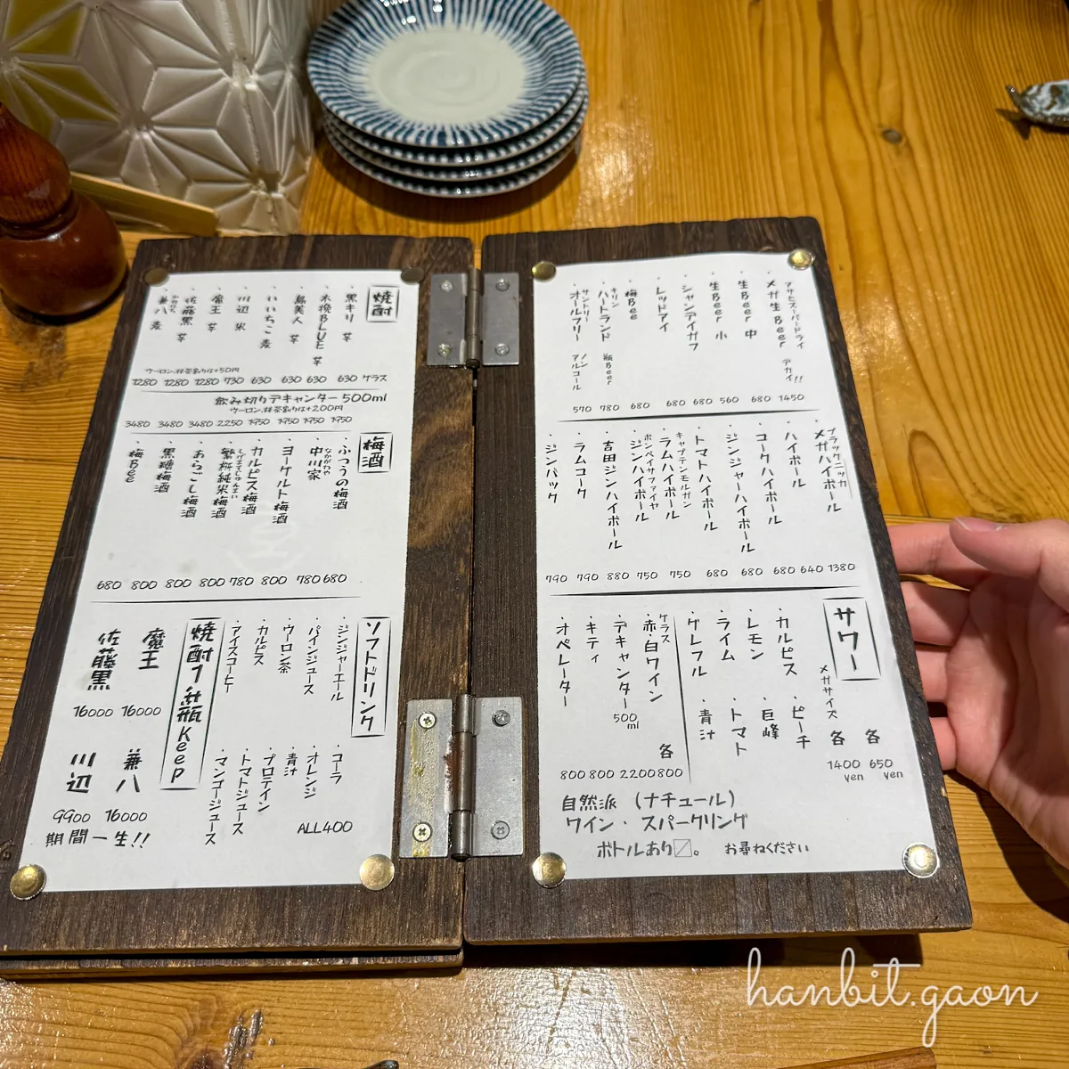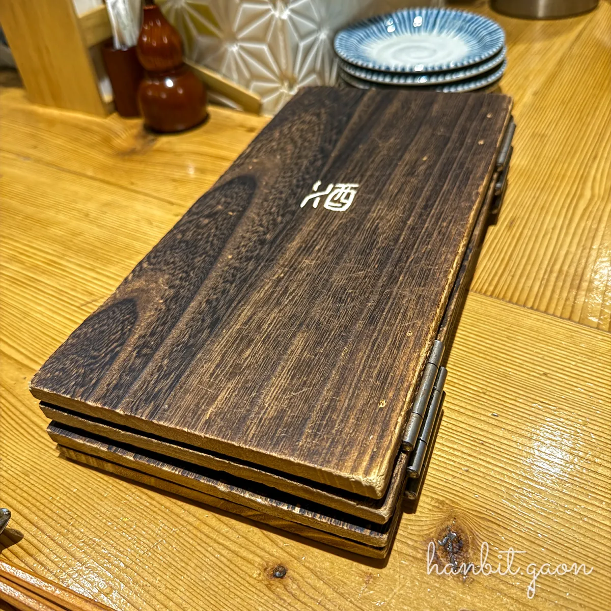 메뉴판이 나무판을 경첩으로 엮어놓은 느낌이었는데, 벌써부터 뭔가 이자카야다운 곳에 온 것 같아서 기분이 좋았어요(술을 마신 영향이었겠지만요 🤣)