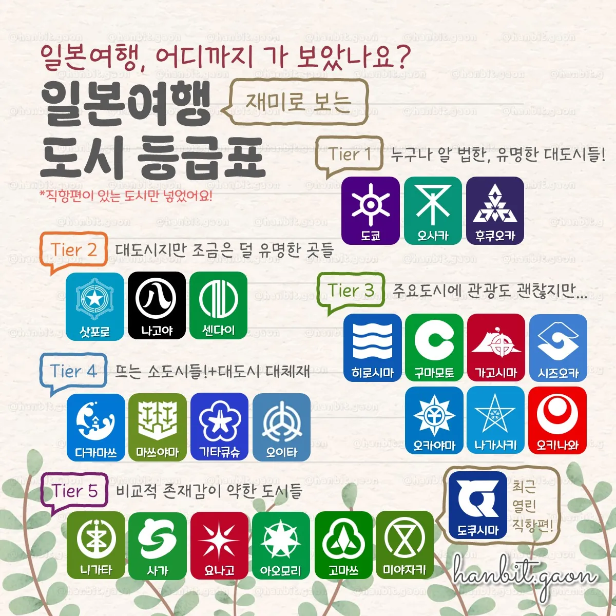 이번에는 일본여행 난이도와 같은 복합적인 분석 및 평가를 통해 등급을 매기려고 하지 않고, 단순하게 직항편이 있는 도시들만 모아서 인지도나 관광 느낌을 고려해서 대략적으로 등급을 5개로 나눠봤어요.