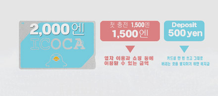 우리나라의 티머니는 처음에 구입금액이 있지만, 서울의 지하철역에서 1회용 교통카드를 구입해 본 분들이라면 500엔을 보증금으로 받고 보증금 환급기에 다 쓴 교통카드를 넣으면 500원을 돌려주는 방식을 아실거에요.