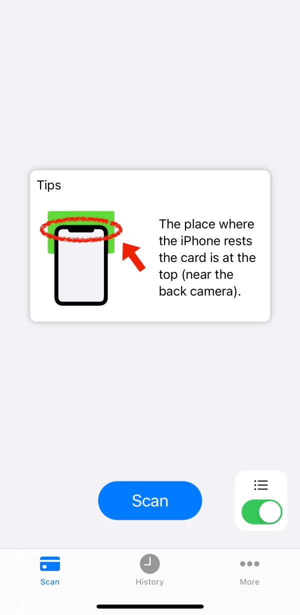 아이폰에서 교통카드를 스캔할 때는 앱 첫화면에서도 설명했듯이 아이폰 상단의 카메라 옆부분에 밀착하는 느낌으로 대주면 스캔이 됩니다.