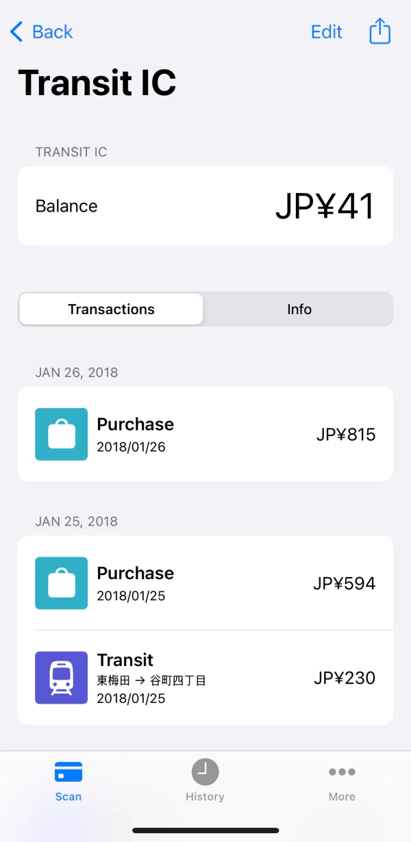 You can check Japanese e-money balance and usage history on your iPhone. Support: ・Transit IC(Suica、PASMO、ICOCA、SUGOCA、TOICA、Kitaca、manaca、nimoca、はやかけん) ・IruCa ・PASPY ・SAPICA ・icsca ・OKICA ・Ryuto ・Rakuten Ed