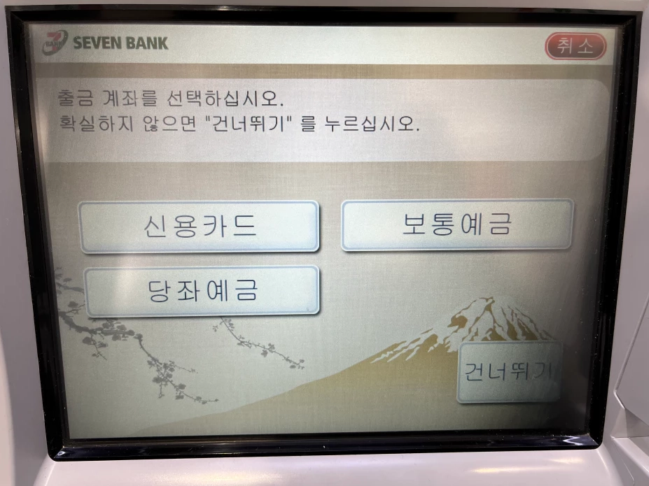 위와 같이 세븐일레븐 로고가 붙은 ATM이 세븐은행 ATM입니다.