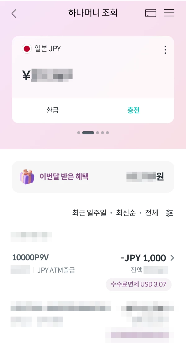 하나머니 앱으로 확인해보니 정확히 1,000엔만 빠져나갔습니다.