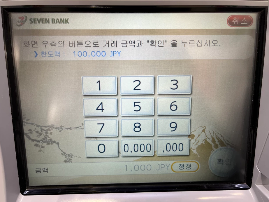 세븐은행 ATM의 1회 인출한도는 10만엔입니다. 최소는 1,000엔부터 가능합니다.