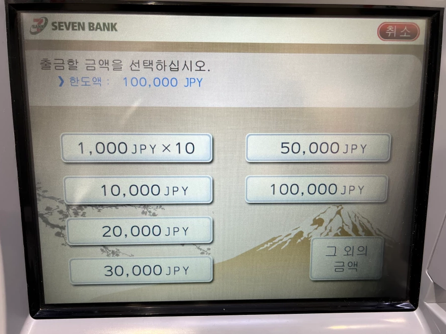 선택지에는 1만엔부터 10만엔까지만 있는데 1,000엔부터 출금이 가능하니 1만엔 미만의 금액을 인출하려면 '그 외의 금액'을 눌러줍니다.