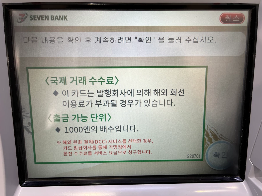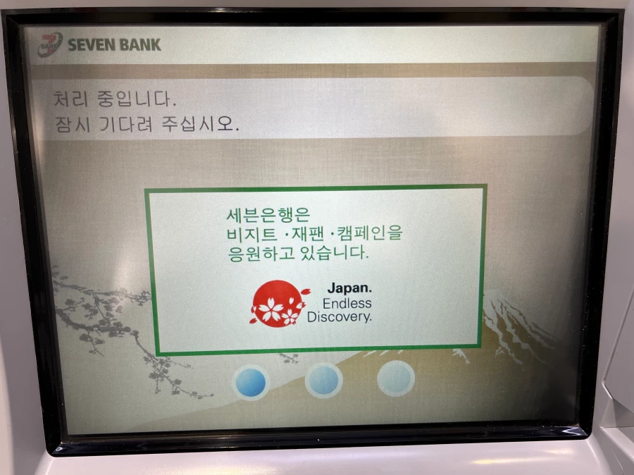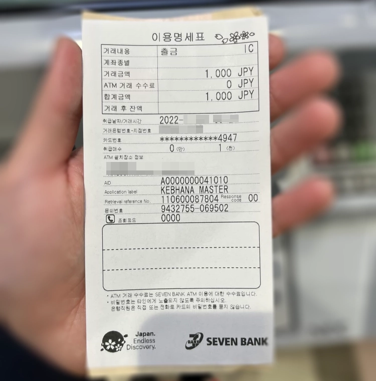 그리고 세븐은행 ATM은 마스터카드 기준으로 따로 ATM 이용 수수료가 붙지 않는 ATM입니다. 일본의 세븐일레븐에서는 볼 수 있는 ATM이라 나름 흔하게 볼 수 있는 ATM이기도 합니다.