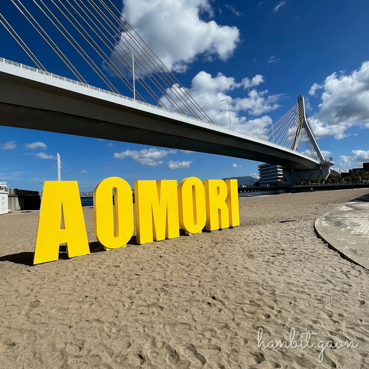 혼슈 최북단 현 '아오모리현'의 최대도시, 아오모리에요!아오모리역에서는 큰 다리 '아오모리 베이브리지'가 보여요.아오모리역 동쪽 출구에서 1~2분 정도만 걸어가면 역 앞 해변이 있