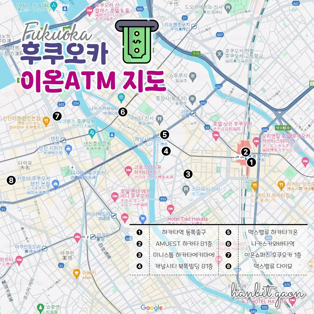 그래서 후쿠오카의 중심지라 할 수 있는 하카타-나카스-텐진 부근의 이온ATM을 정리해봤어요!