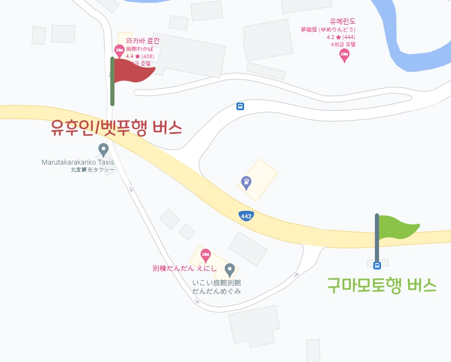 각각 위성지도와 일반지도로 표시한 이미지입니다. 붉은 깃발의 '유후인/벳푸행 버스' 정류장이 구마모토에서 쿠로카와 온천으로 오면 내리는 정류장입니다. 내려주고 유후인/벳푸로 향하니까요.