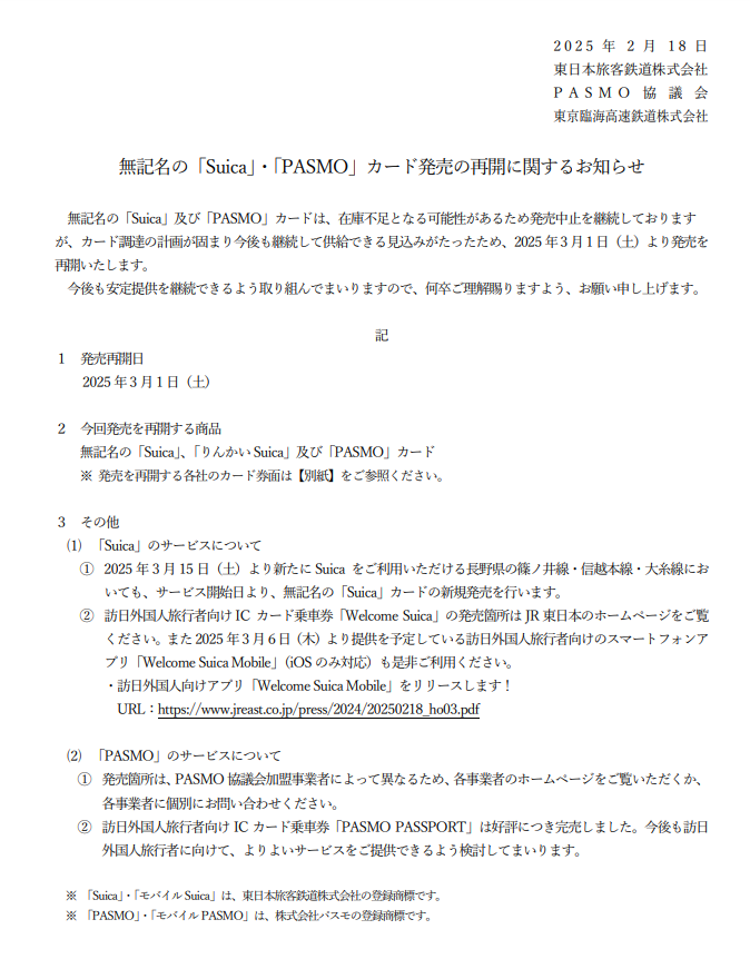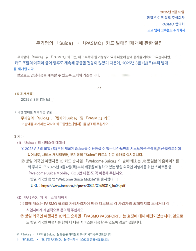 그러던 중, 이번에 3월 1일부로 일반 스이카(무기명 스이카), 일반 파스모(무기명 파스모) 모두 판매를 재개한다고 해요.