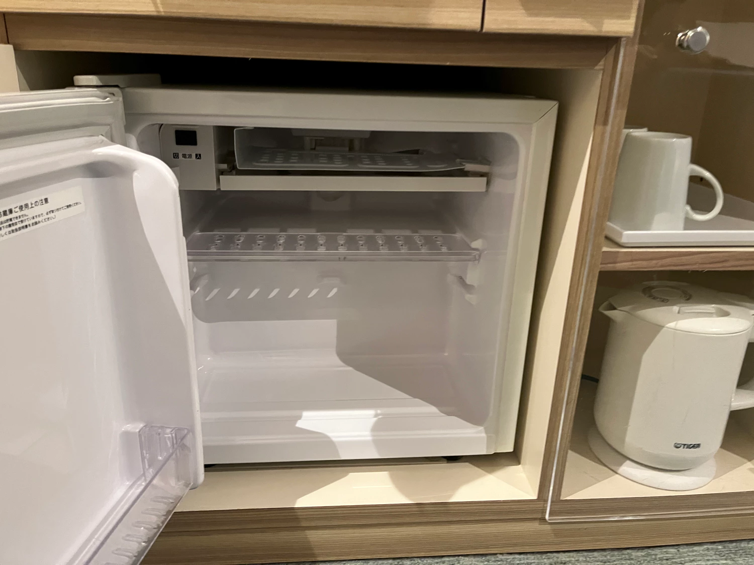 냉장고 안에는 생수 한 병도 없는게 보입니다. 또한 냉장고가 꺼져있어 위쪽의 스위치를 켜주고 냉장고 안쪽에 보면 검은색 스위치를 켜줘야 냉장고가 시원해지기 시작합니다.