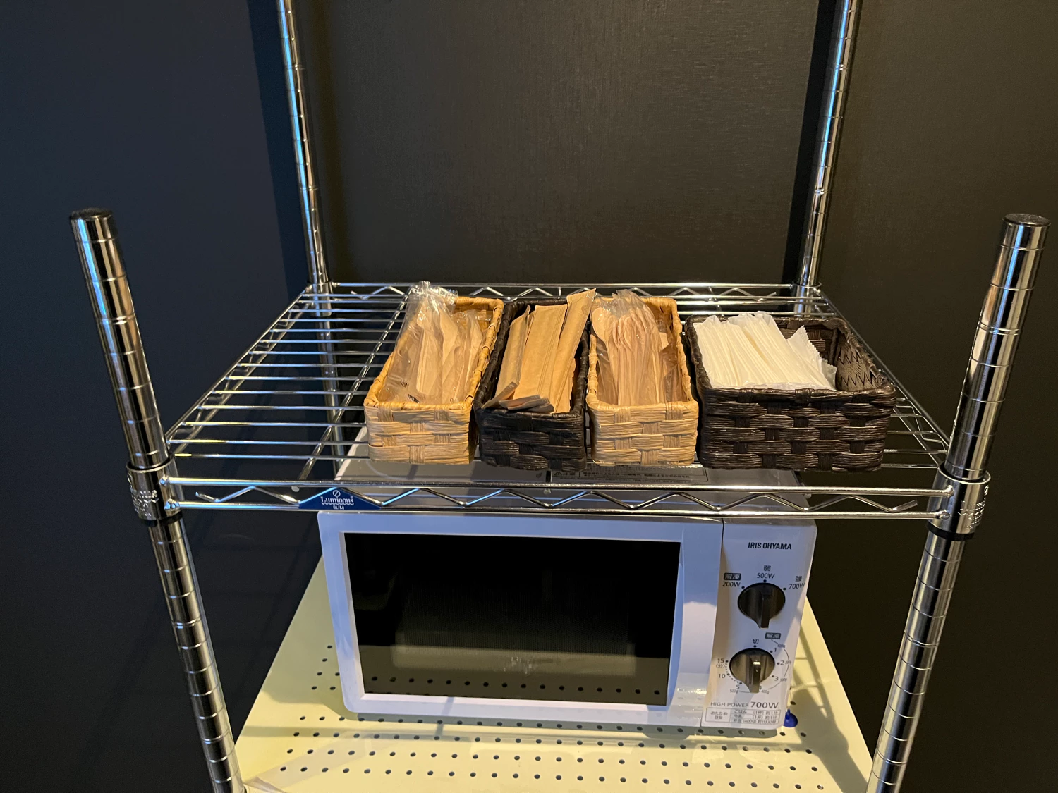 뒤편으로는 전자레인지가 있고 전자레인지 위쪽에 나무젓가락, 포크, 물티슈, 냅킨이 비치되어 있습니다.