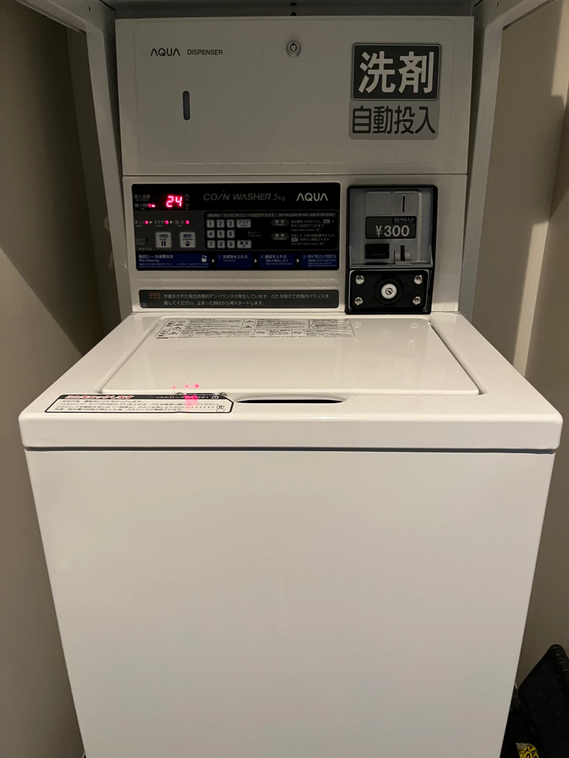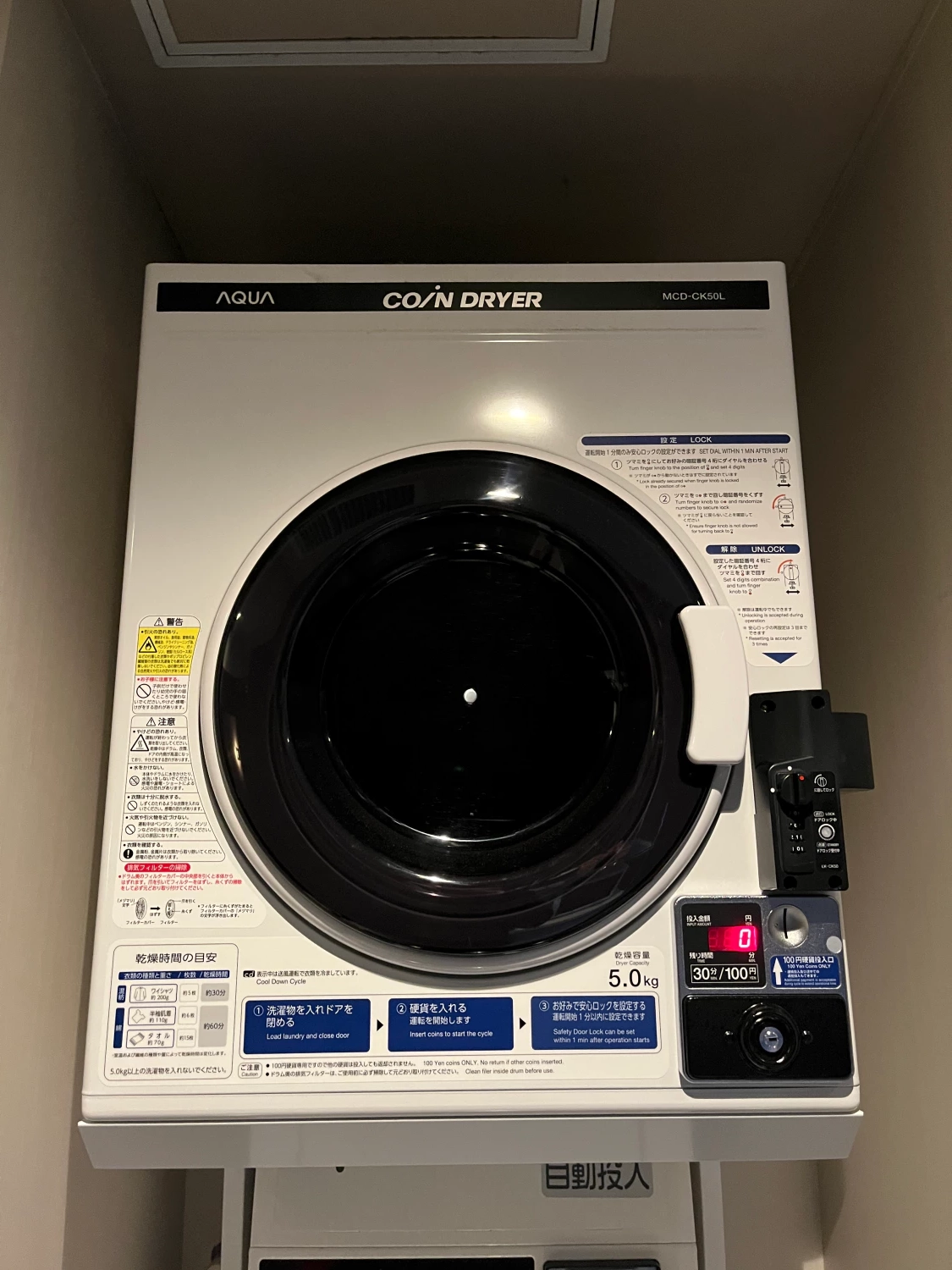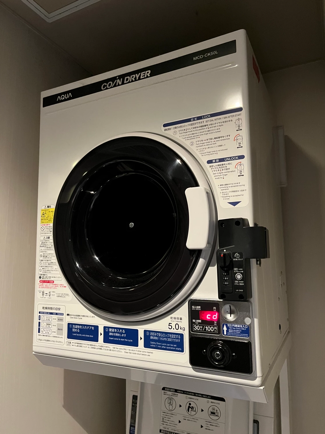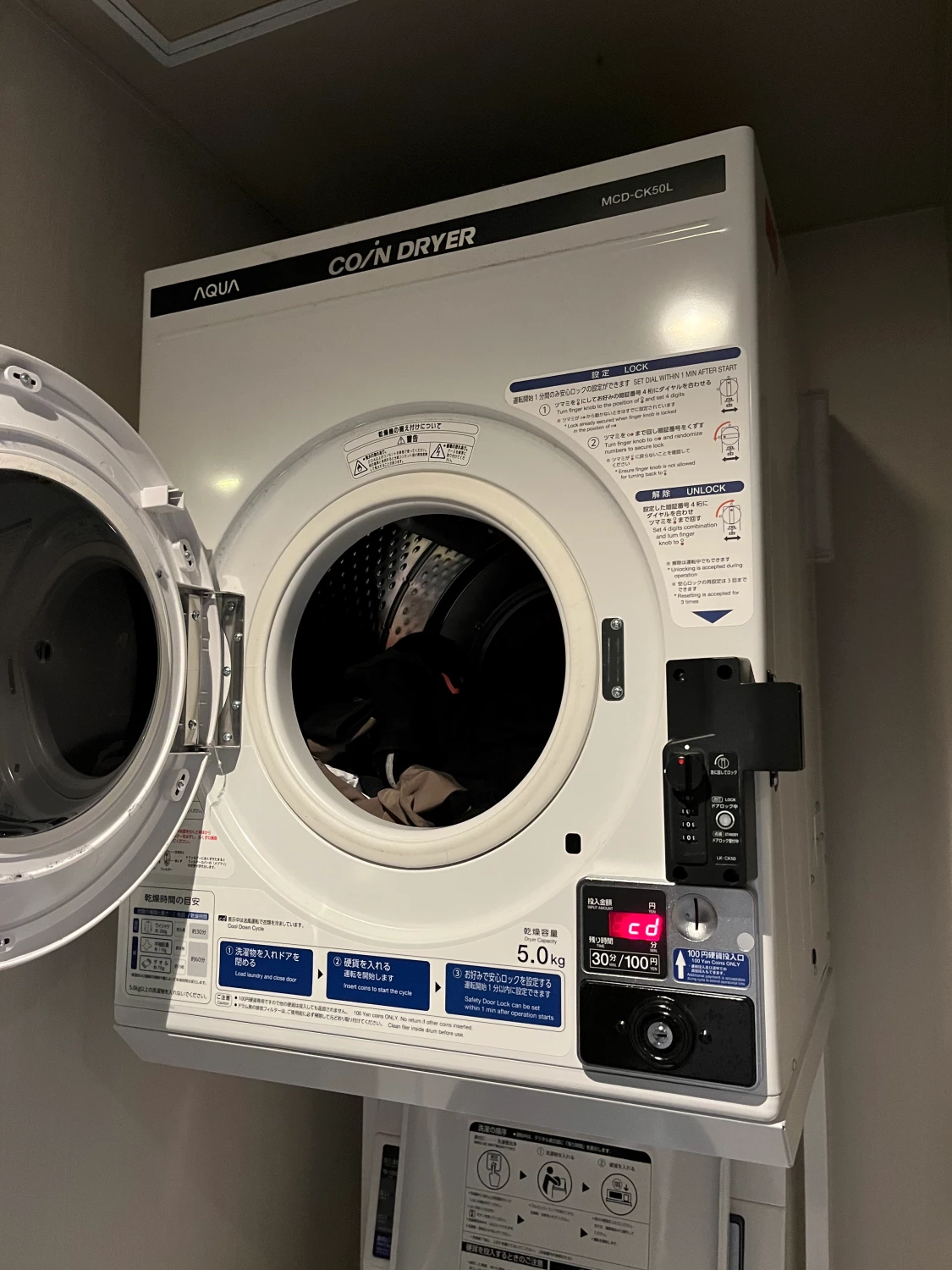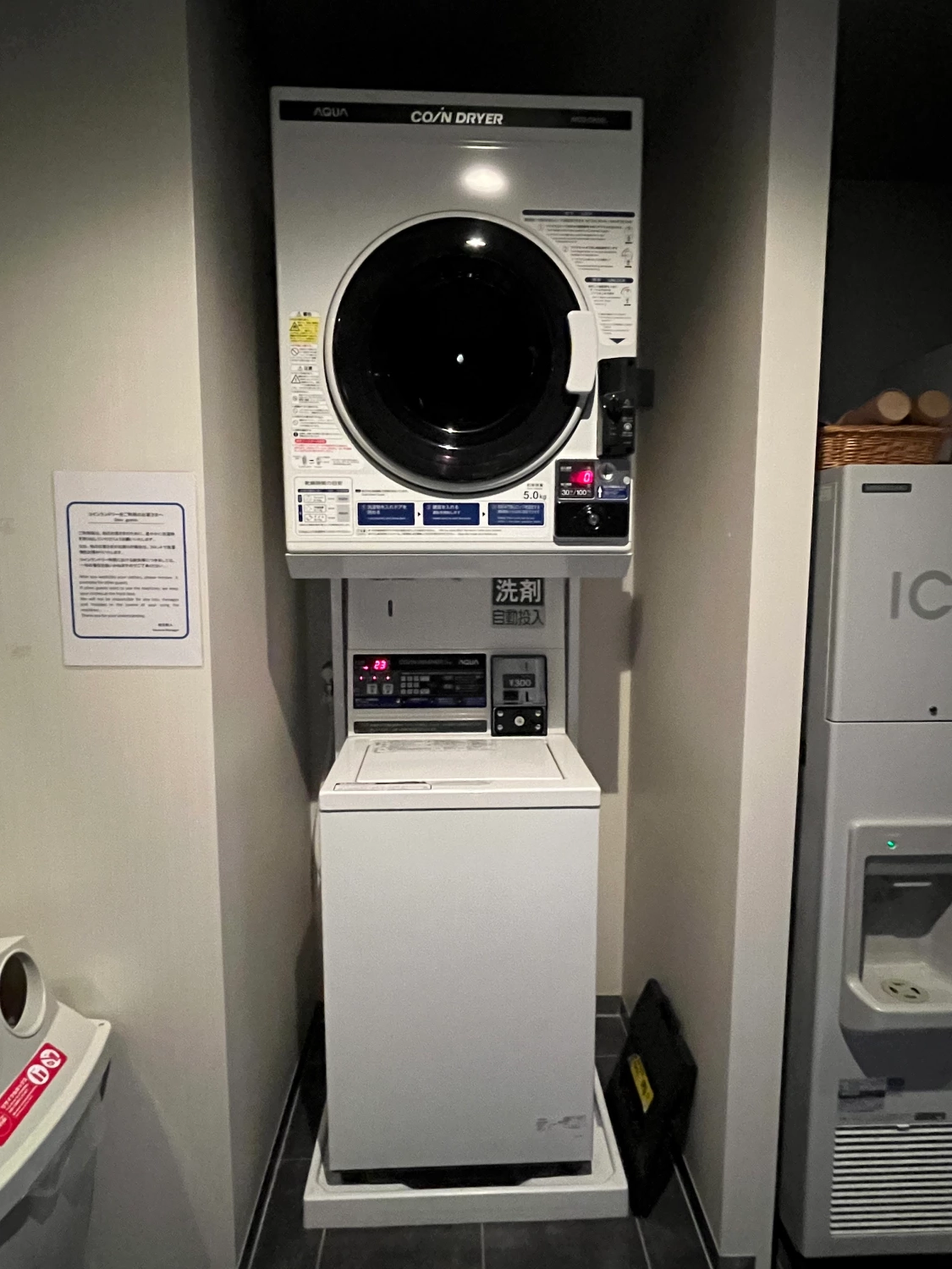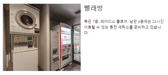호텔에는 남관 4층, 북관 7층, 레이디스 플로어에 셀프 세탁기와 건조기가 있습니다. 세탁기는 1회 300엔, 건조기는 30분에 100엔인데 30분으로는 부족하니 60분은 필요하여 200엔 정도 생각하면 될 것으로 보입니다.