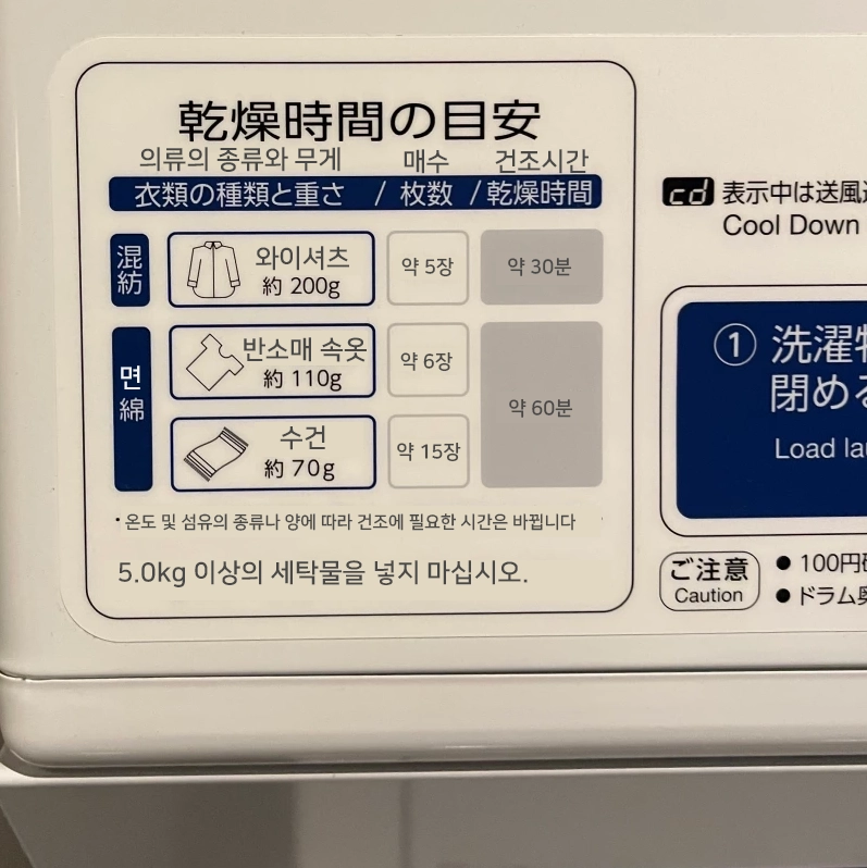 건조기는 30분에 100엔이나 60분은 필요합니다.