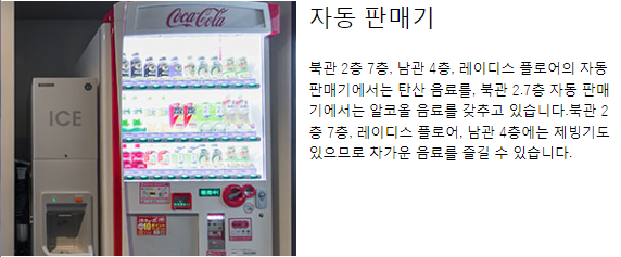 자판기, 전자레인지, 제빙기 : 남관 4층, 북관 2층/7층, 레이디스 플로어에 위치