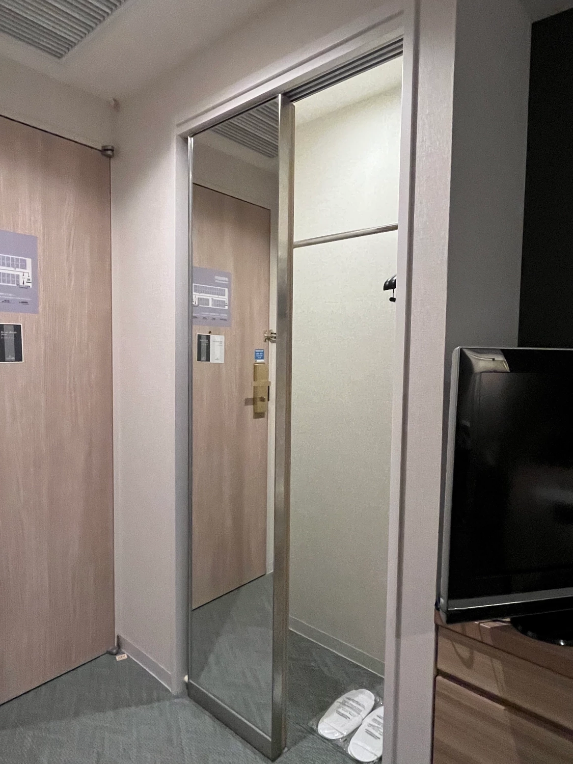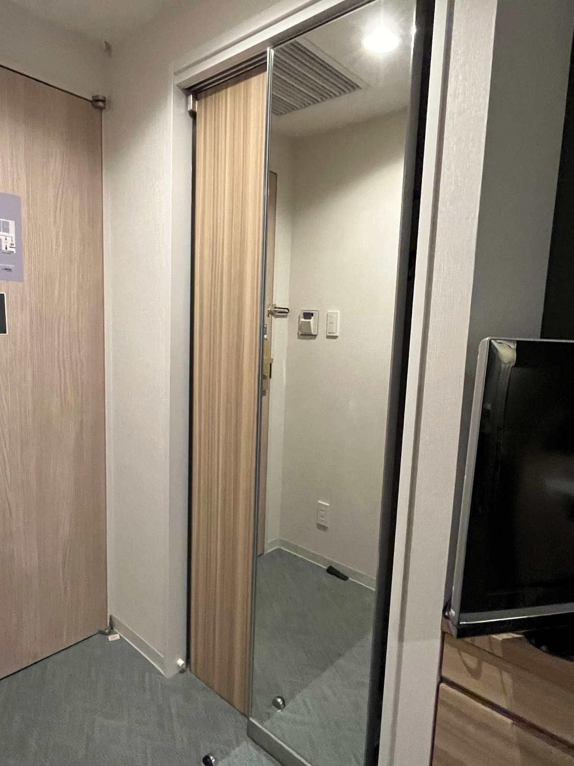 문 앞에 옷장이 있습니다. 전신거울이 붙어있는 형태입니다.