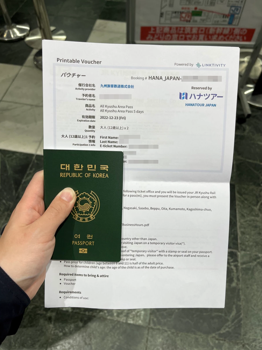 미리 국내에서 구입한 큐슈레일패스 바우처와 여권, 사전에 레일패스로 예약했던 예약증도 준비하고 줄을 서서 기다려요.