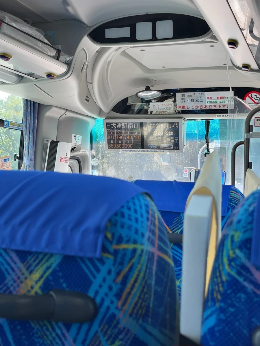 버스가 정차하고 내릴 사람들은 내리고 벳푸/유후인까지 갈 사람들은 계속해서 가요.