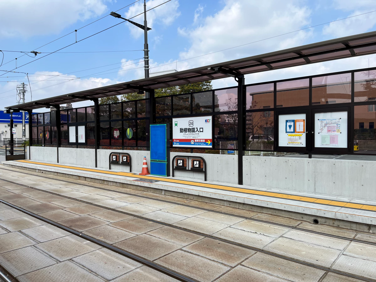 노면전차 정류장 '동식물원입구'에서 노면전차를 기다려요.