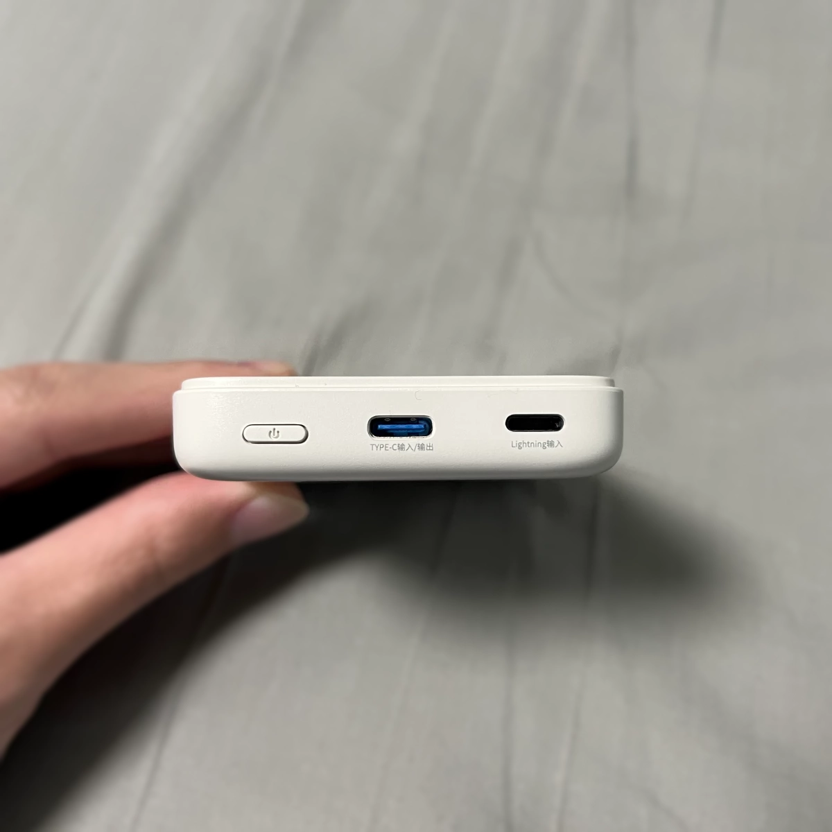 하단입니다. 전원버튼, C타입 포트, 라이트닝 포트가 있습니다. 보조배터리를 사용하려면 전원 버튼을 눌러줘야 된다고 합니다.