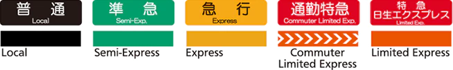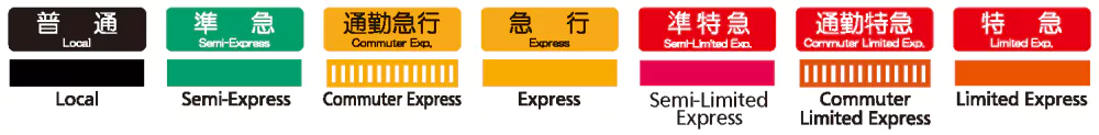 왼쪽의 검은색으로 표시된 보통열차(로컬/LOCAL)는 노선 상의 모든 역에 정차하는 열차이고 오른쪽으로 갈수록 정차하는 역이 줄어들어요!
