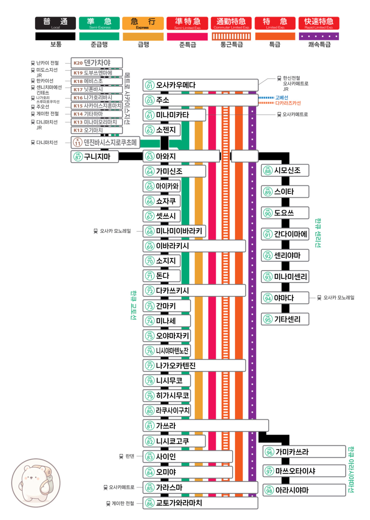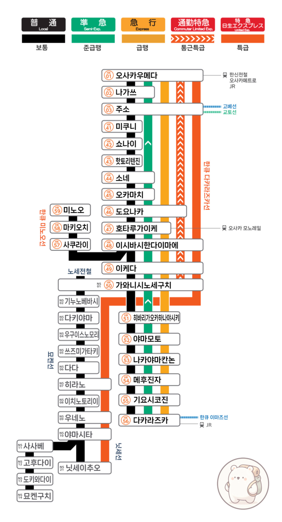 아래의 열차 종류와 노선도는 2023년 3월에 한큐전철 홈페이지에서 확인한 자료에요.