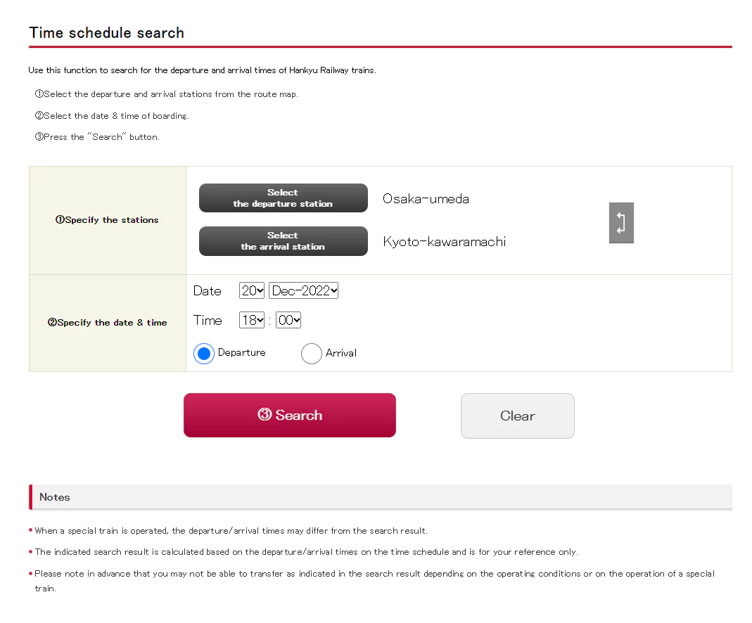 Use this function to search for the departure and arrival times of Hankyu Railway trains. ①Select the departure and arrival stations from the route map. ②Select the date & time of boarding. ③Press the "Search" button.