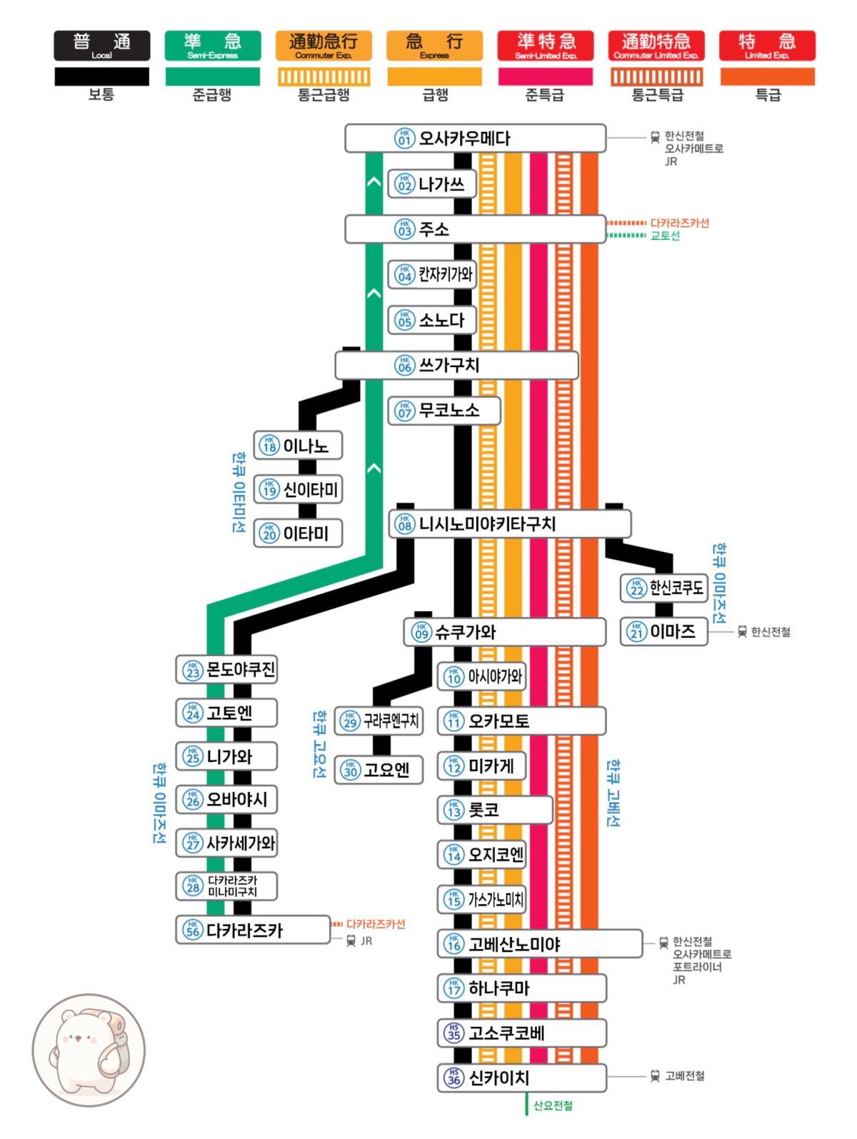 위에서 적은대로 보통열차(LOCAL)는 모든 역에 정차하는데, 제일 빠른 특급(Limited Express)의 경우 오사카우메다역을 출발하여 주소, 니시노미야키타구치, 오카모토, 고베산노미야역 순으로 정차하여 우메다역에서 고베산노미야역까지 4번 정차합니다.