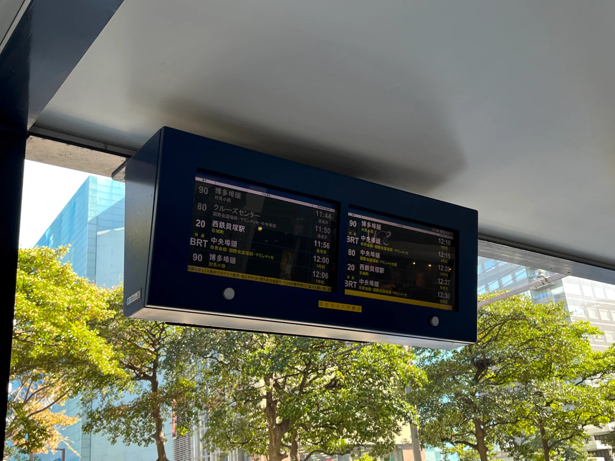 90번 버스와 20번 버스가 하카타부두쪽으로 가는 버스인데, 90번 버스가 하카타부두 앞에 내리지만 20번 버스가 10분이나 빨리 오는 관계로 20번 버스를 타고 조금 걸을 생각이에요.