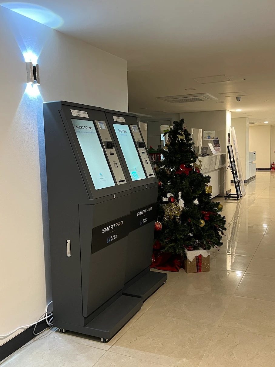 여담으로, 프론트데스크가 24시간 운영하는 형태가 아니라서 그런지 키오스크를 2개 놓아두고 체크인/체크아웃/키재발급이 가능하게 해 두었습니다.