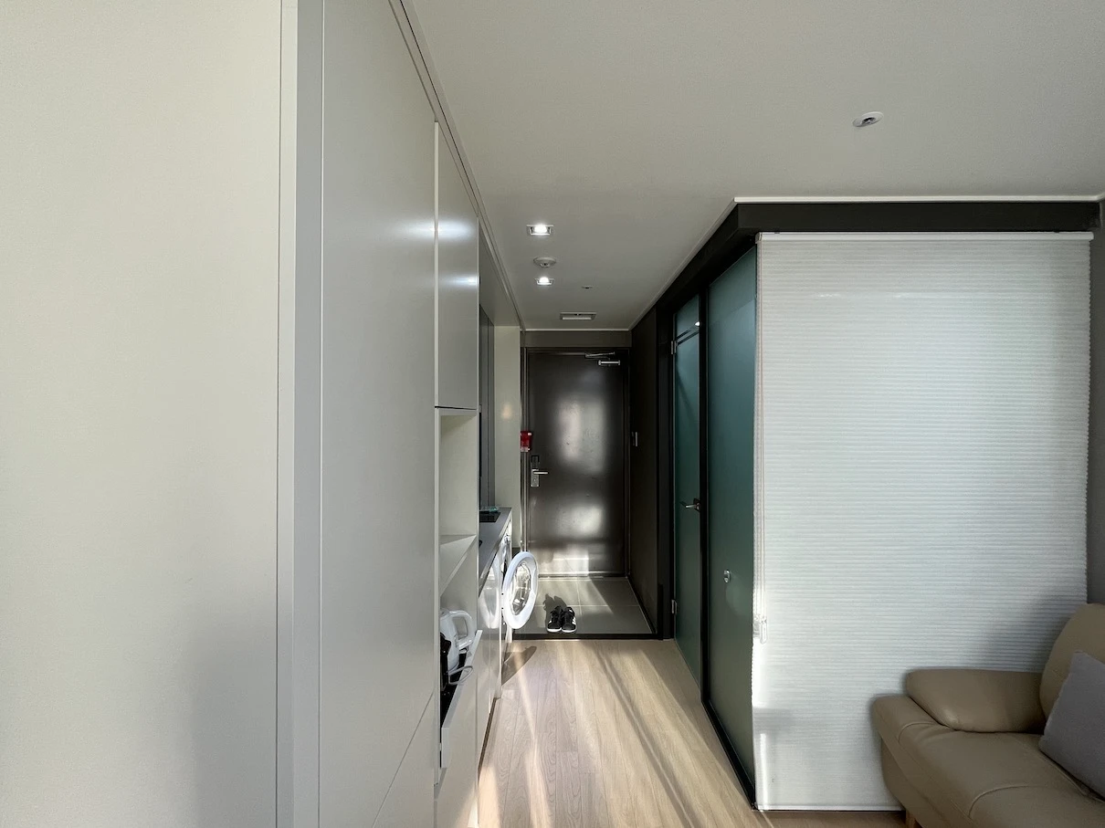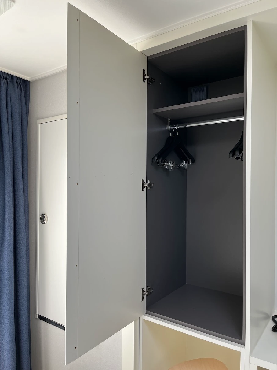 아쉬운 점이라면 이번에 12월에 방문했기에 코트를 입고 갔었는데 옷장 내부 높이가 그렇게 높은 편은 아니라 코트의 경우 옷장 바닥에 조금 끌리는 느낌으로 둘 수밖에 없었던 것이 아쉬웠습니다.