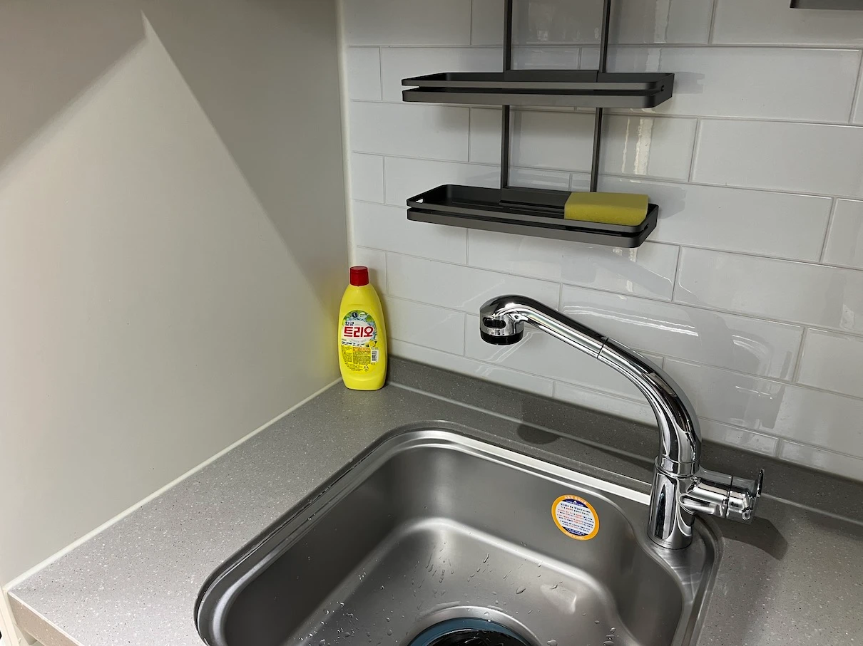 싱크대에는 수세미와 주방세제가 있습니다.