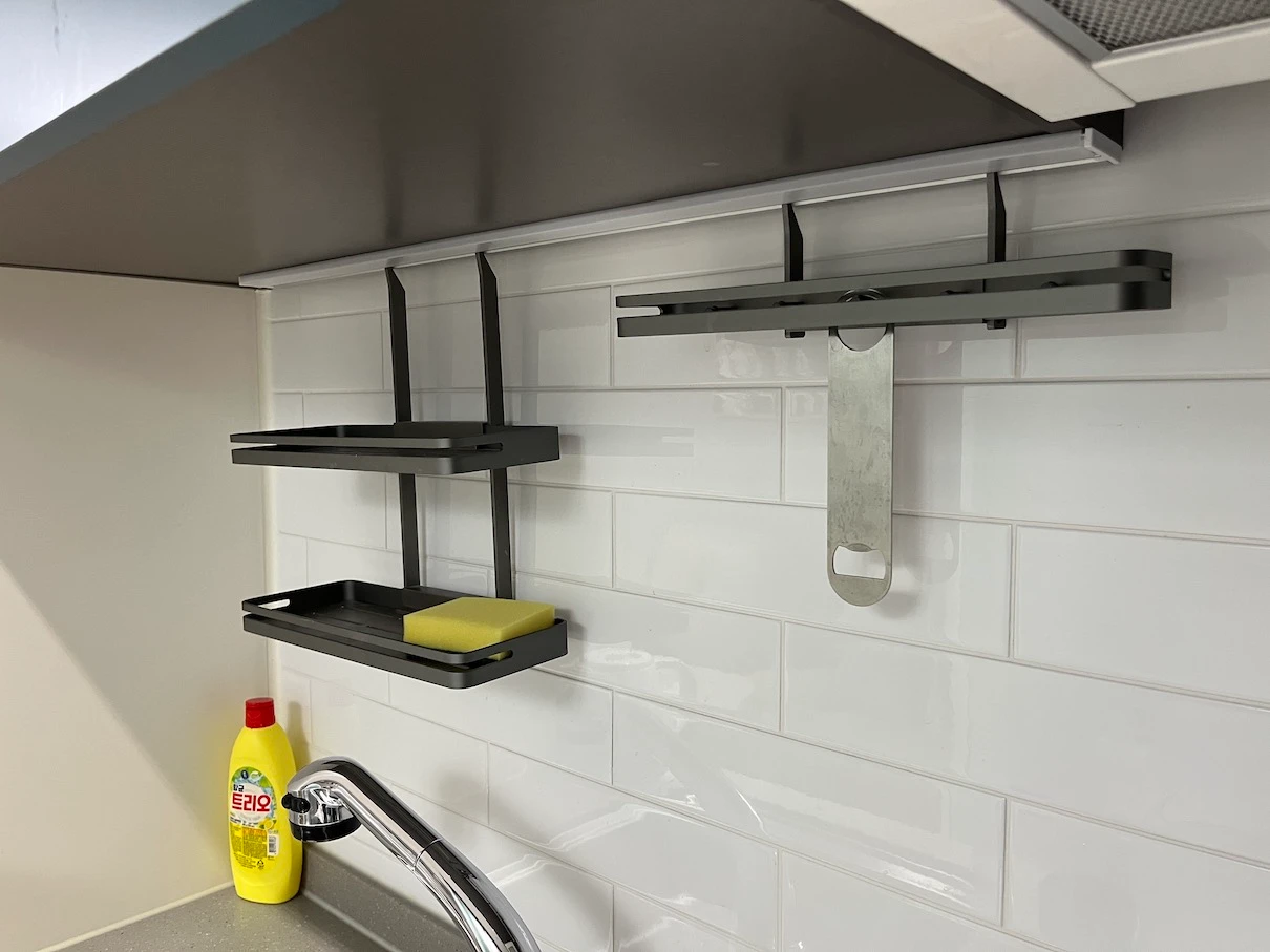 싱크대 위쪽에는 머그컵, 와인잔, 소주잔, 접시가 작은 것과 큰 것이 각각 2개씩 있었습니다.