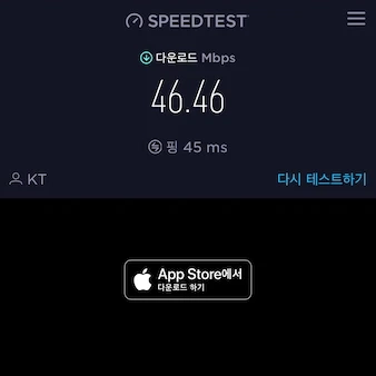 속도를 다른 시간으로 2번을 측정했습니다. 2번 모두 50Mbps 정도의 속도였는데 적당히 쓰기에는 문제없는 속도였습니다.