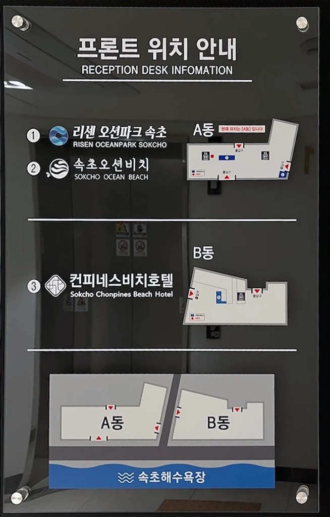 A동에는 리센 오션파크 속초와 속초오션비치, B동에는 컨피네스비치호텔이 있고 위에 있는 안내 표지판처럼 호텔마다 프론트데스크 위치가 다릅니다.
